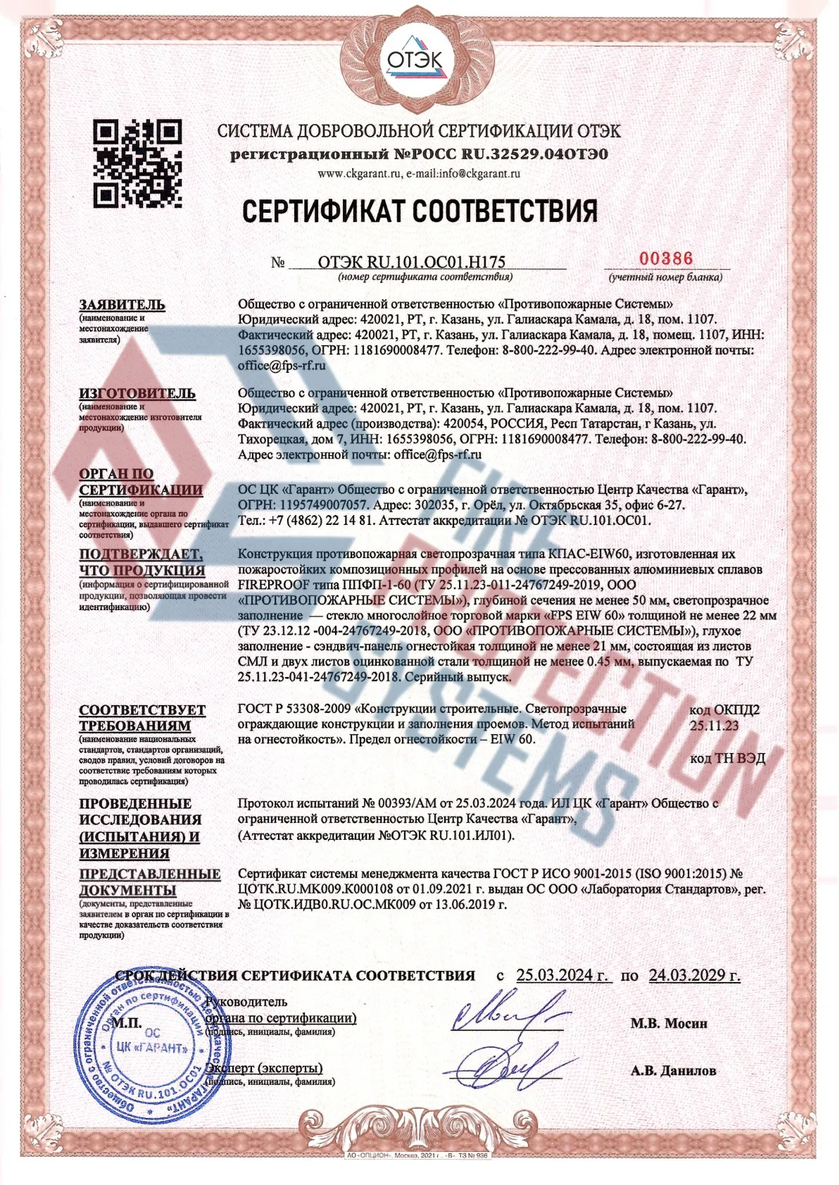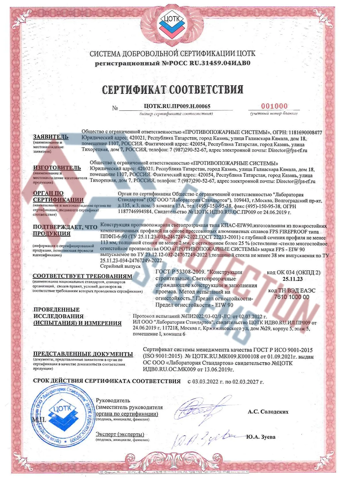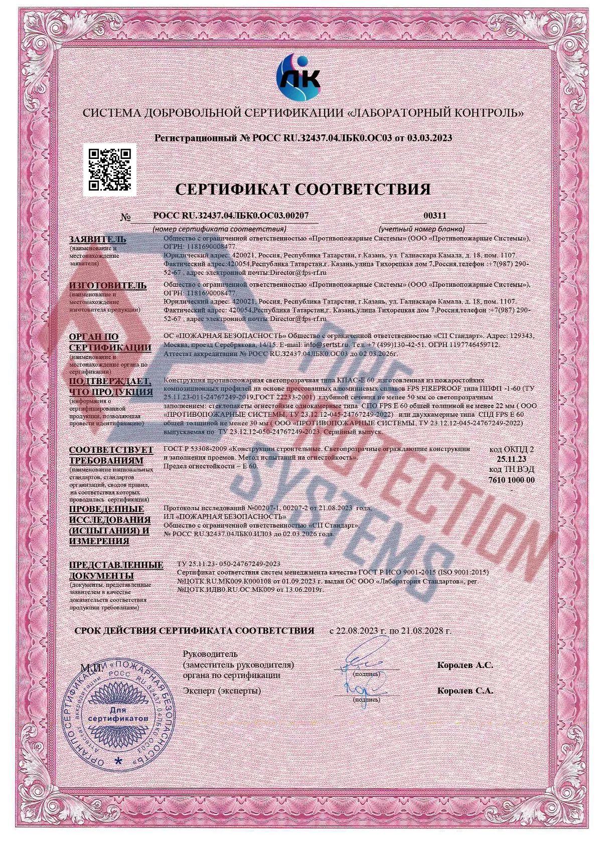 Соответствие нормам – сертифицированы по ГОСТ Р 53308-2009 и другим стандартам пожарной безопасности.